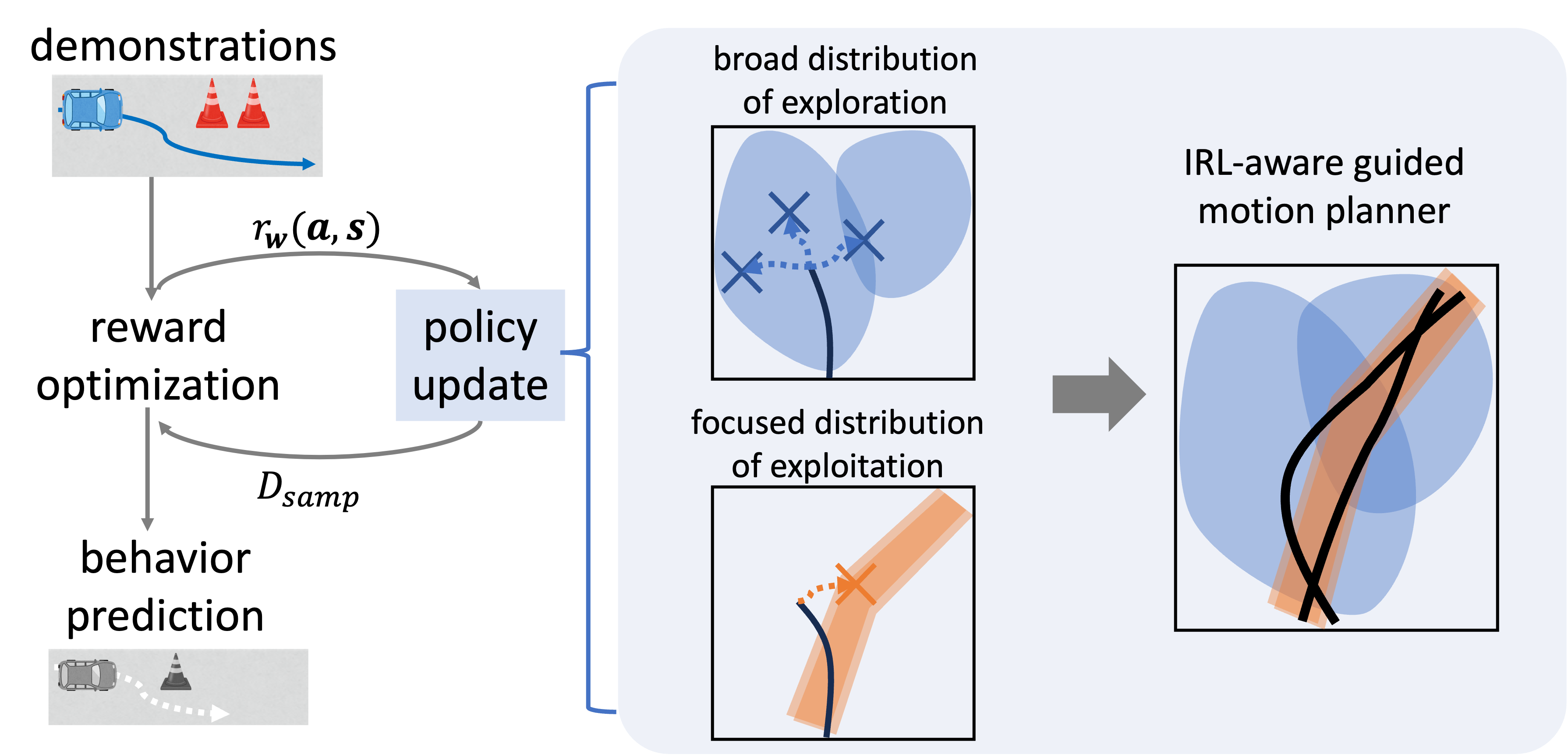 最大エントロピー逆強化学習では,報酬関数の推定において分配関数の近似が必要となり,そのために軌跡サンプリングが用いられます.しかし,従来のモーションプランナは状態空間全体を広く探索する一方で,人間のデモンストレーションに近い領域を効率的に探索できない場合があり,得られるサンプルがエキスパートの行動を十分に反映しないという問題がありました.その結果,報酬推定の精度が低下し,連続状態空間における学習の安定性が損なわれる可能性があります.