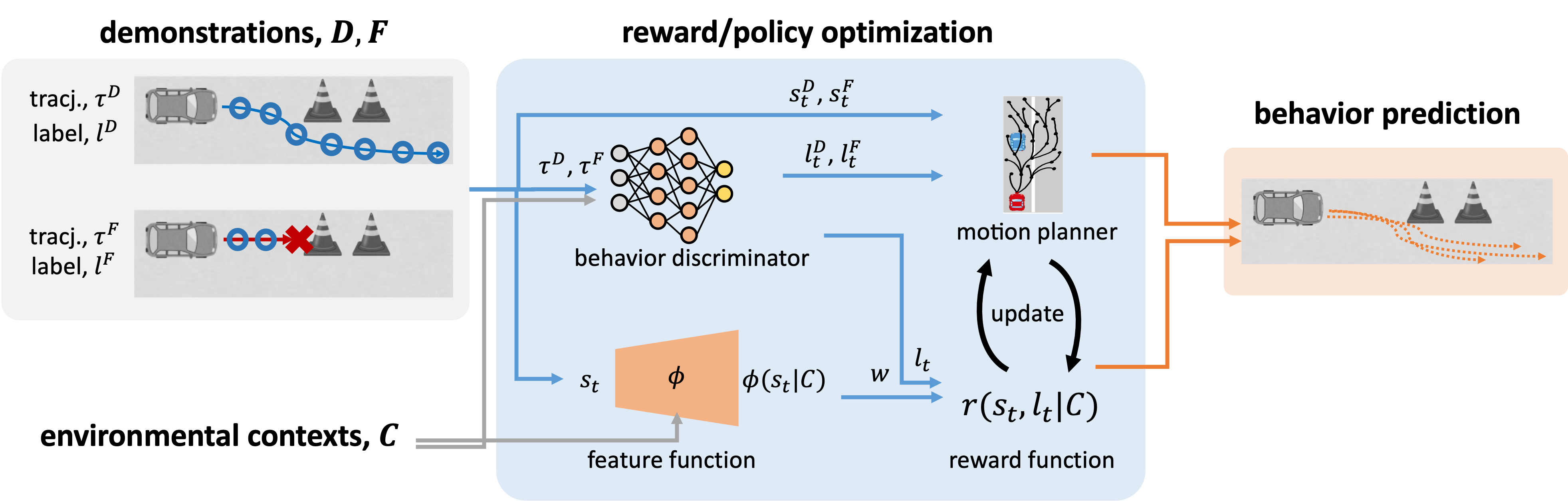 そこで我々は,これらの課題に対して単純に既存手法を組み合わせるのではなく,状態ごとの安全性を直接扱うための行動識別器を導入した新たな逆強化学習フレームワークを提案しました(趙ら,IEEE International Conference on Intelligent Transportation Systems 2025).この手法では,識別器が環境コンテキストに基づいて各状態に安全ラベルを付与し,報酬推定と並行して学習されます.これにより,追加の制約付き最適化を導入することなく,状態単位での細粒度な安全性情報を統合的に取り込むことが可能となり,疎な失敗データ下においても,連続状態空間における安定性と安全性の両立を実現します(図3).